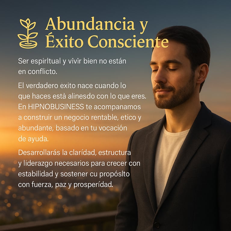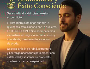 El verdadero éxito nace cuando lo que haces está alineado con lo que eres. En HIPNOBUSINESS te acompañamos a construir un negocio rentable, ético y abundante, basado en tu vocación de ayuda. Desarrollarás la claridad, estructura y liderazgo necesarios para crecer con estabilidad y sostener tu propósito con fuerza, paz y prosperidad.