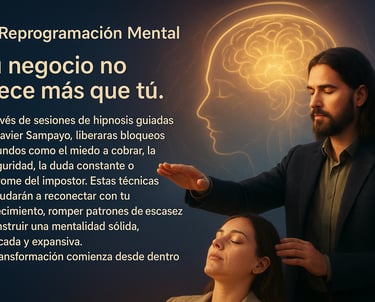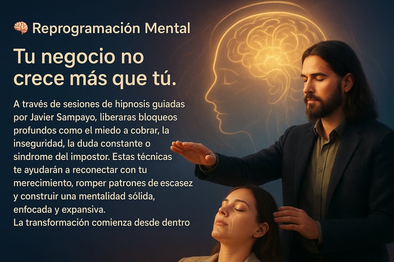 A través de sesiones de hipnosis guiadas por Javier Sampayo, liberarás bloqueos profundos como el miedo a cobrar, la inseguridad, la duda constante o el síndrome del impostor. Estas técnicas te ayudarán a reconectar con tu merecimiento, romper patrones de escasez y construir una mentalidad sólida, enfocada y expansiva. La transformación comienza desde dentro.
